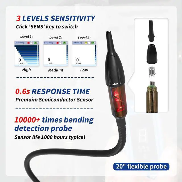 [Lightweight & User-Friendly Design]: Compact, ergonomic build with three-buttons operation. Ideal for HVAC technicians and auto repair pros needing a portable Freon leak detector for on-site diagnostics. Longer 20 inch sensor probe allows access to difficult-to-reach areas