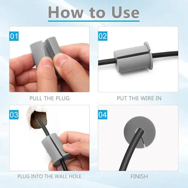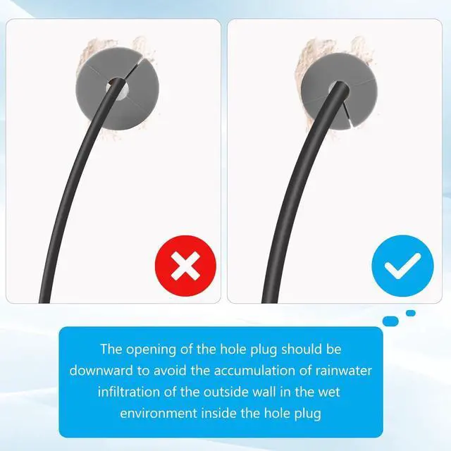 : Using the cable grommet is incredibly straightforward. Simply thread the cable through the central hole of the product and insert it into the wall hole to finish. To prevent rainwater from seeping in from the exterior wall and accumulating within the grommet's interior, ensure the grommet's opening faces downwards.