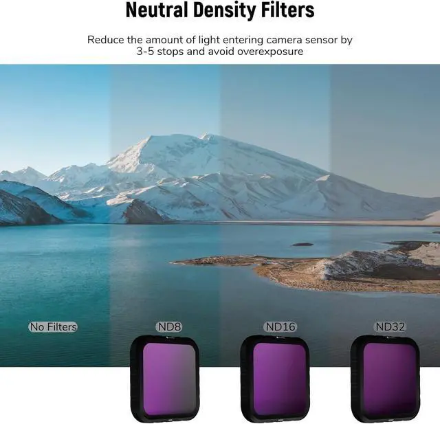 Reduce Sunlight by Different LevelsNeutral density filters reduce the amount of filters entering your camera sensor to avoid overexposure and slow shutter speed for long exposure shots. ND8 reduce light exposure by 3 stops, ND16 by 4 stops, and ND32 by 5 stops