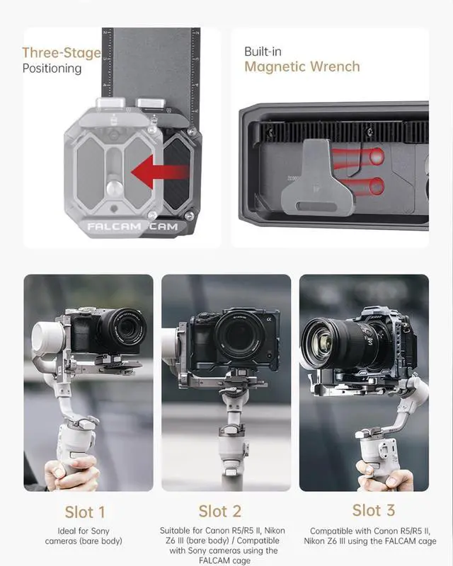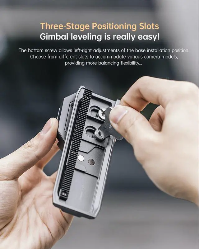 Three-Stage Positioning Slots for Flexible Balancing - The adjustable mounting slots allow easy left-right adjustments, ensuring compatibility with various camera models. Achieve precise gimbal balance without hassle.