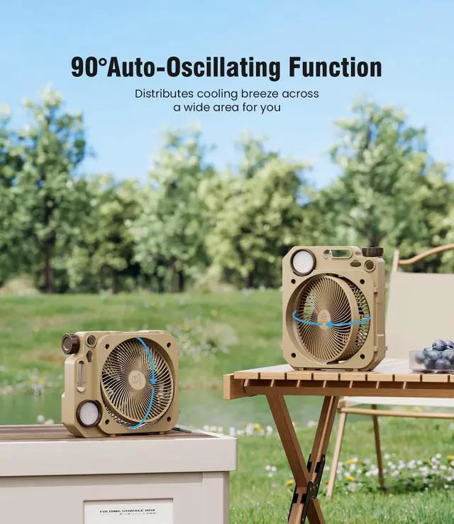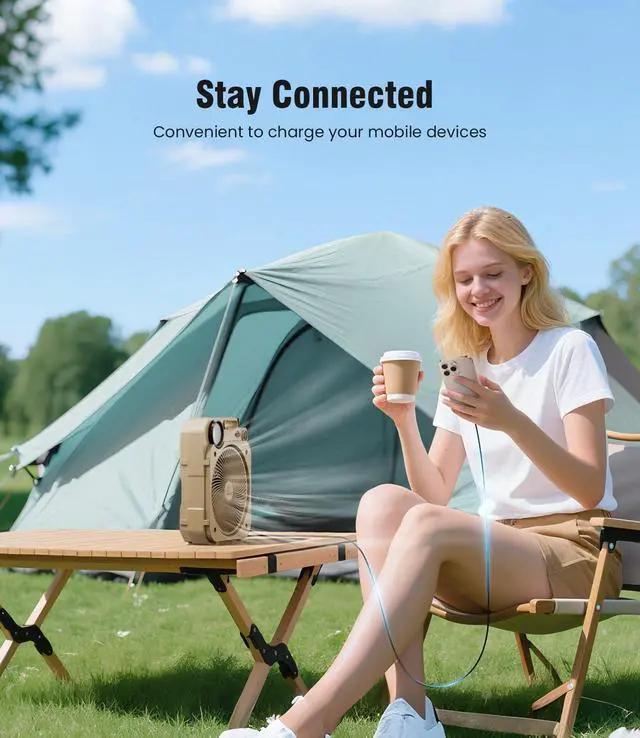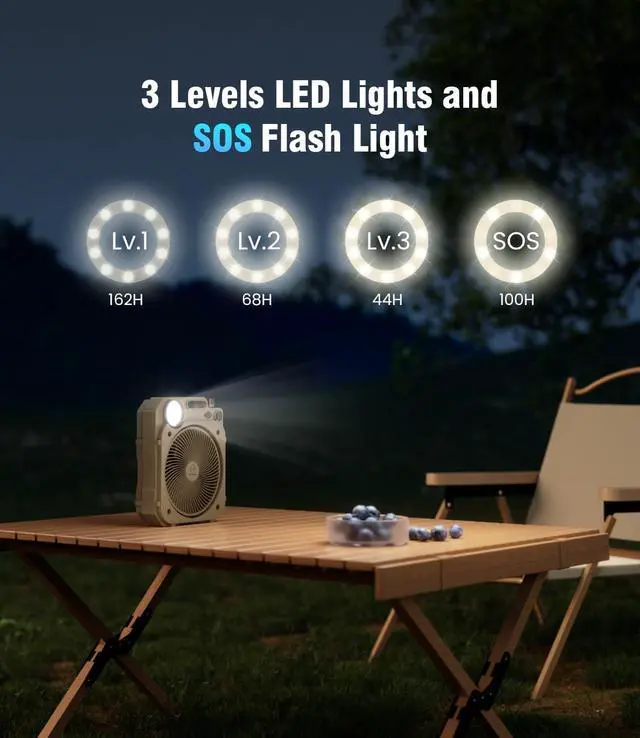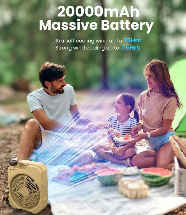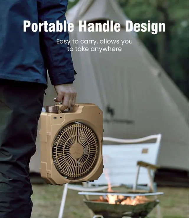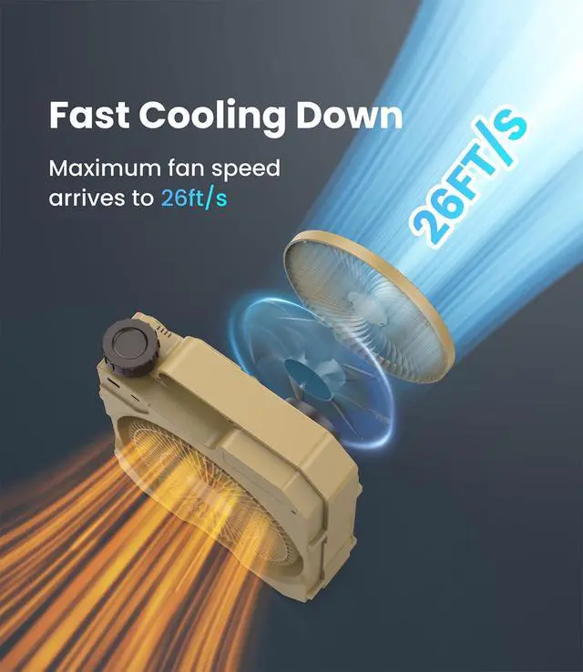 High Velocity & Stepless Speed Control: outdoor camping fan adopts latest brushless motor technology and high-performance ultra-thin 7 fan blades, which makes the maximum strong airflow arrives to 26 ft/s at lowest noise ( <20 db); There is a knob stepless speed control, let you to choose any fan speed in different environment; Also, there are 4 LED INDICATORS to show the remaining battery