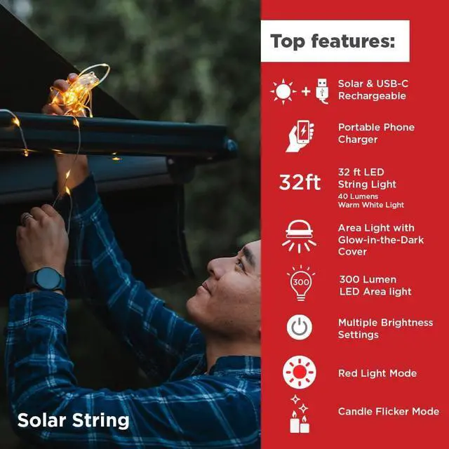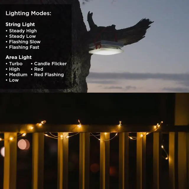 32-FOOT STRING LIGHT - 40 lumen warm white string light has 4 modes: steady high, steady low, flashing fast, and flashing slow.