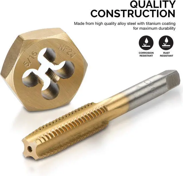 The 00916A Pro-Grade Large-Diameter Titanium SAE Tap and Die Set gives you extra precision when you need to repair stripped threads and screws. Each tap and die is constructed from professional-grade steel and features a titanium coating for added longevity and protection against rust and corrosion. The titanium edges keep these tools sharp for a precise cut every time, so they can handle even the toughest threads.