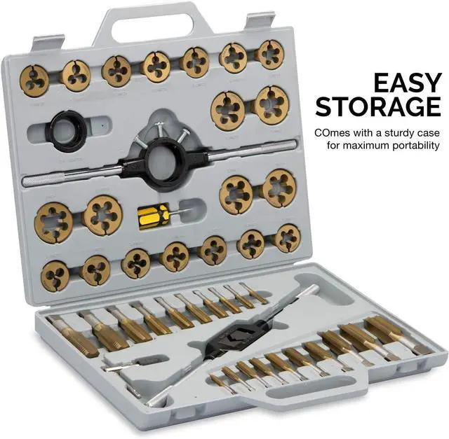 CONVENIENT TOOLS: Our kit includes 1 die-stock handle wrench, 1 adjustable tap-handle wrench, 1 T-handle tap wrench, 1 die adapter, and 1 stubby screwdriver. This precise set comes in a heavy-duty blow-molded case for easy storage and travel.