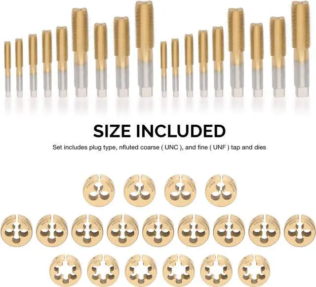 Each tap and die features a coarse (UNC) or fine (UNF) thread designation and will fit a wide variety of hand-threading applications. Each tool also features a laser-etched size marking for easy and quick identification. Ideal for automotive or electrical work, this tap die set is a useful addition to home and professional tool collections.