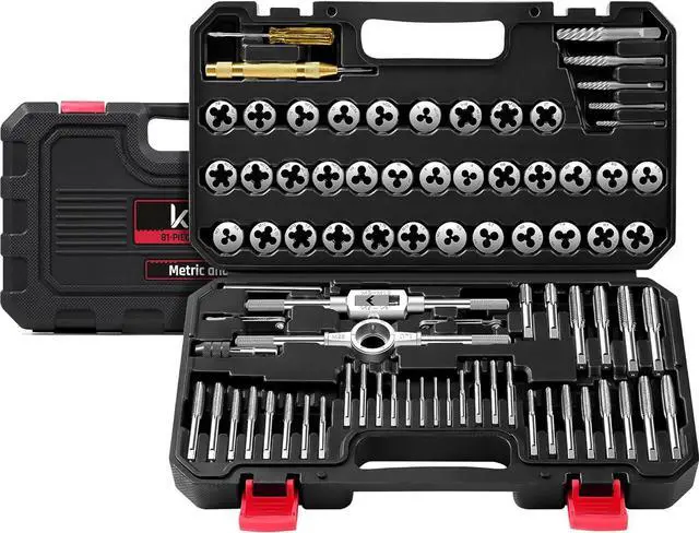 Complete Accessory Kit: 68 Taps and dies, long handle tap wrench, T-handle tap wrench, adjustable die wrench, screwdriver, metric and SAE thread pitch gauges, centre punch, 5 spiral flute extractorsall neatly stored in a rugged blow-molded case