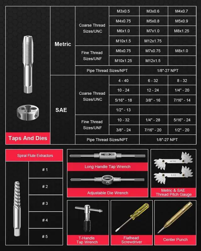 Dual Thread Pitch Gauges & Spiral Extractors: Includes both SAE and metric thread pitch gauges for fast, accurate thread identification. Spiral flute bolt extractors (EZ-Out style) help remove broken bolts and studs without damaging surrounding threadssaving time on repairs