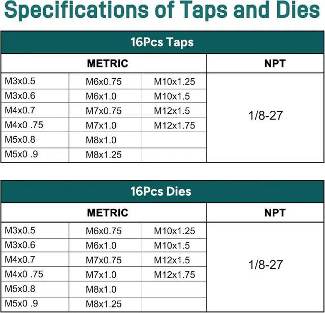 Wide Application: The tap and die set metric is suitable for creating new threads or repairing damaged threads on most metals (carbon steel, aluminum, copper, cast iron, brass, and stainless steel)