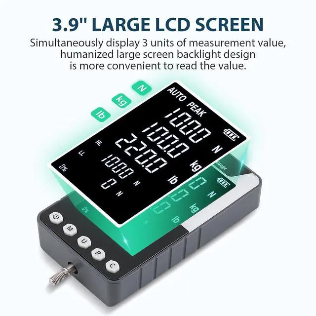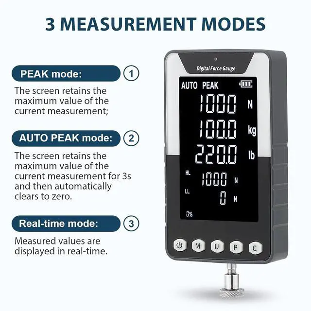 Intuitive Main Features: Our device boasts three measurement modes Real-Time, Peak, and First Peak Value with free switching to cater to your specific needs. The long-press function on the U button allows for screen value flipping, adapting to various measurement scenarios. Additionally, the Upper and Lower Limits (HL & LL) warning feature helps detect qualified products, enhancing your quality control processes.