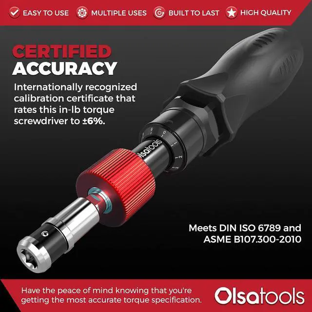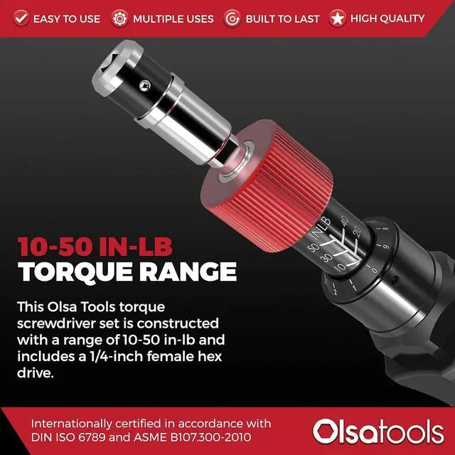 TORQUE RANGE - The torque screwdriver set is constructed with a range of 10 - 50 in-lb with accurate torque specs with ±6% accuracy through the entire torque range and includes a 1/4-inch female hex drive.