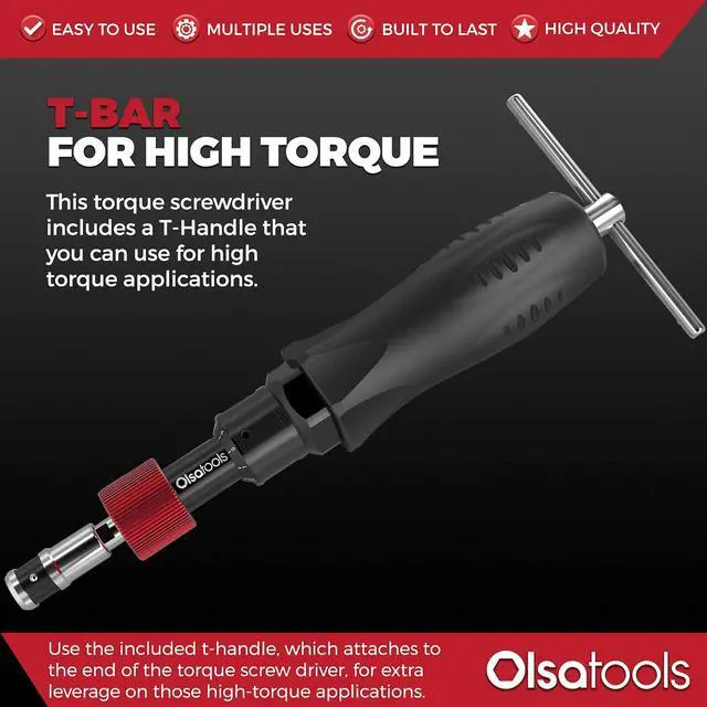 T-BAR INCLUDED FOR HIGH TORQUING - Use the included t-handle, which attaches to the end of the torque screw driver, for extra leverage on those high-torque applications.