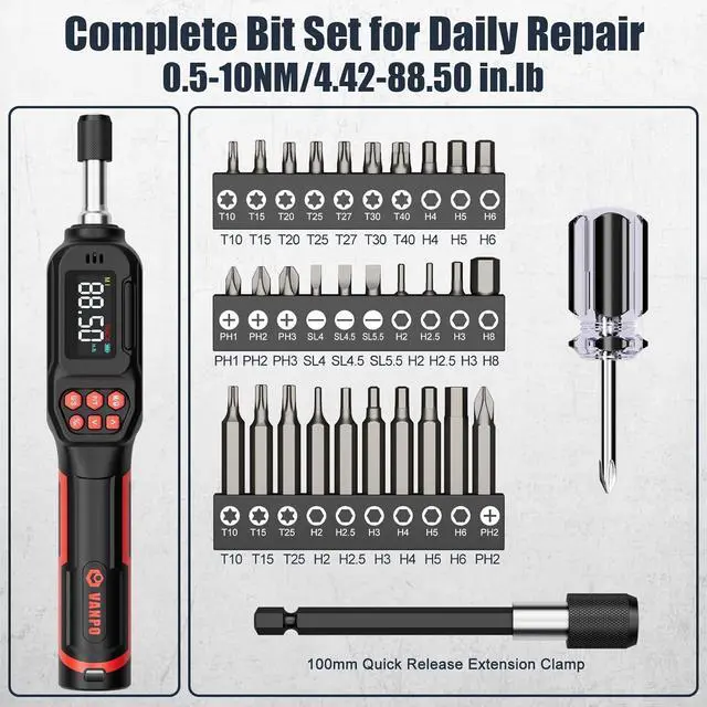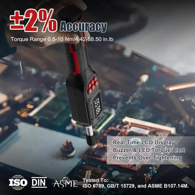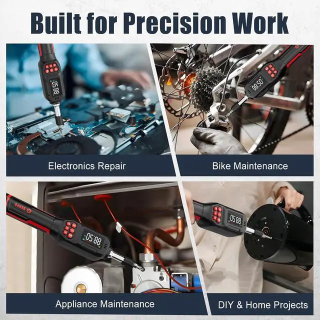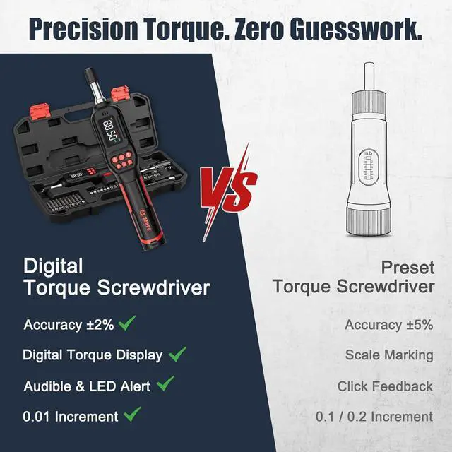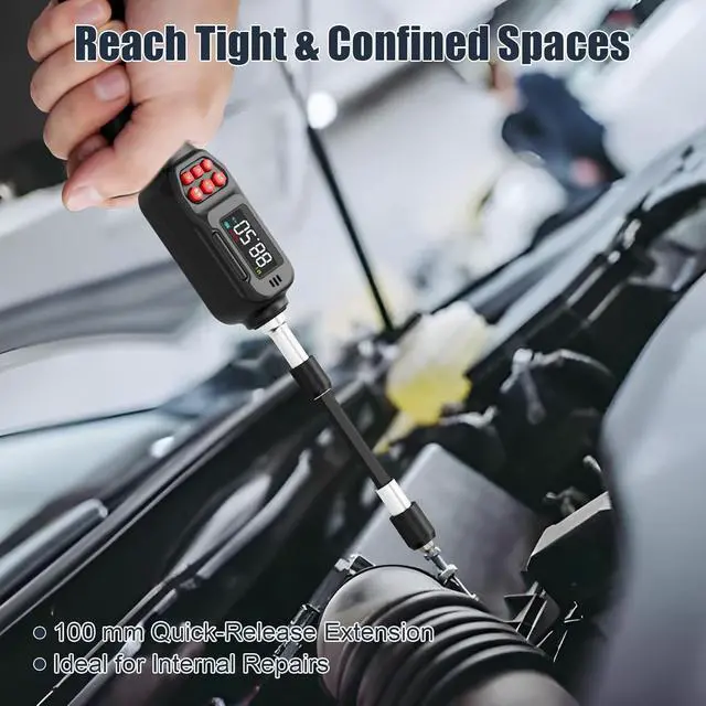 & Audio): Features a crystal-clear torque screwdriver digital LCD display and an integrated sensory feedback system. As you approach your target torque screwdriver value, the audible buzzer and flashing LED provide instant warnings to ensure zero-overtightening. A must-have torque screwdriver electrician tool for working in noisy or dim environments.