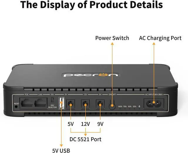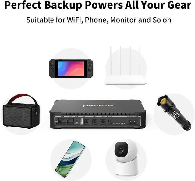 76.96W h Uninterrupted Power Supply By connecting it to your devices like WiFi router, modem, or security camera in advance, this UPS battery backup will automatically provide continuous power during outage. Ensure your internet connection stays active and your home security. The clear LED battery power indicator lets you monitor the remaining capacity at a glance. You can promptly recharge the battery backup as needed