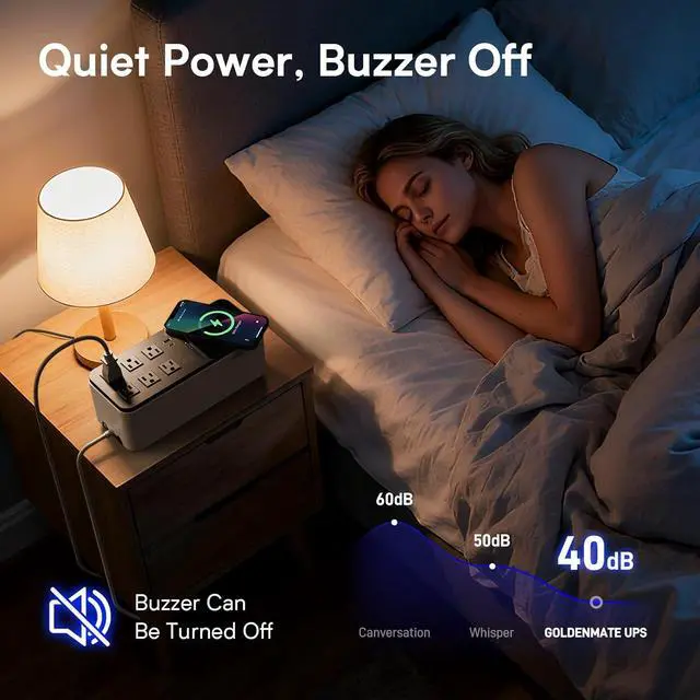 [Warm Note]: The power button of this product integrates three main functions. First, it serves as the UPS power control long press the button for 2 seconds to turn the unit on or off. Second, it controls the activation of the front-panel USB charging ports and the wireless charging pad simply press the button once to enable or disable this feature. Third, it functions as a mute control when the UPS switches to battery power during a power outage and an alarm sounds, double-click the button to temporarily silence the alarm