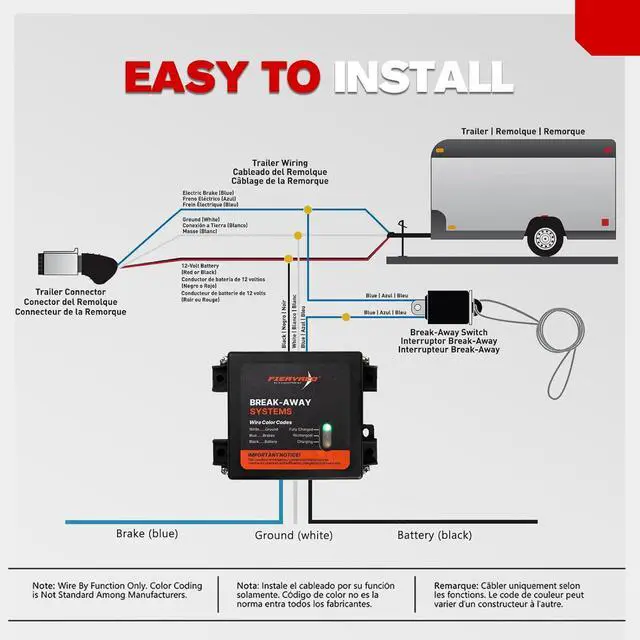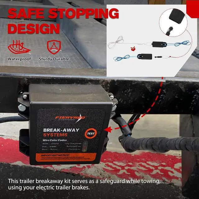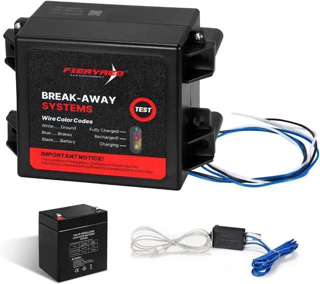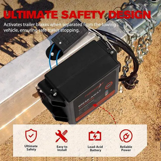 Easy to Install: The brakes breakaway kit comes with pre-wired, colour-coded cables for battery (black), brakes (blue) & ground (white). The battery box & the switch can be easily installed with screws / rivets. You can mount the brakes breakaway kit almost anywhere on trailer, but mostly on the frame for convenience. A 1-year warranty serves as quality assurance of the trailer brakes breakaway.