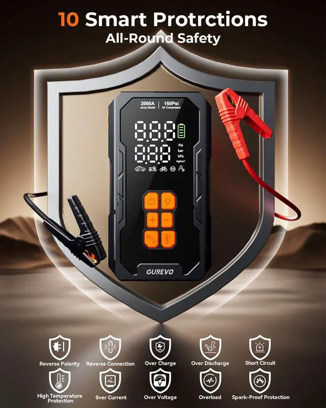 More Reliable: Our jump starter with air compressor features a high-efficiency Battery Management System (BMS) that monitors, controls, and optimizes the battery pack in real time. The car jump starter helps protect and extend battery life while delivering safety performance up to three times greater than standard starters. With 10 key protectionssuch as short circuit, overcurrent, and overheating protectionit ensures your car starts smoothly and safely without risk of damage