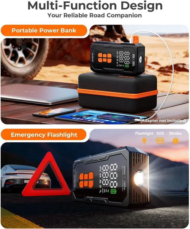 Charging Assistant: More than just a jump starter power pack, this powerful device also functions as a portable power bankcapable of charging phones, laptops, and other devices on the go. Its long-lasting battery ensures reliable performance when you need it most. Even in challenging weather conditions, jump starters delivers dependable power. Equipped with a built-in LED flashlight with SOS mode, its the perfect companion for road trips, camping, and unexpected emergencies