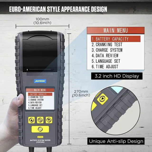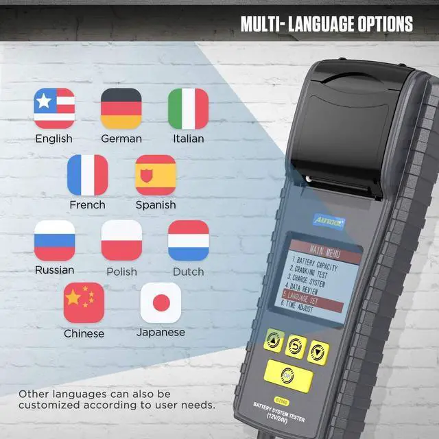 most battery rating systems: BCI, SAE, CCA, IEC, EN, CA, DIN, MCA, JIS, GB. Real-time time display and supports for 10 languages(English, French, German, Italian, Spanish, etc. ).