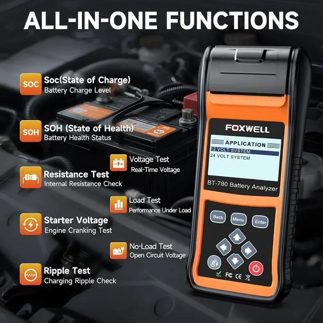 BUILT FOR DAILY PROFESSIONAL WORK - Equipped with 6.5 ft reinforced cableslonger than 98% of battery testersfor comfortable solo in-vehicle testing. A large Clear 3.2 -inch LCD display ensures results are easy to read at a glance, even in low-light shop environments. Heavy-duty clamps for stable contact, and a protective hard carrying case for transport and storage. Built to withstand the demands of daily shop use, the BT780 battery analyzer is designed for long service life and reliable performancemaking it a smart investment for repair shops, dealerships, fleets, mobile technicians, and battery retailers.