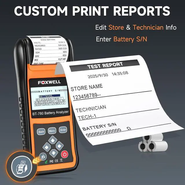 TRACEABLE REPORTS WITH MULTI-USER ACCOUNT SUPPORT - Designed for accountable shop operations, this automotive battery tester supports up to 4 user profiles and customizable report headers including shop name, technician ID, and battery serial numbers. Every test is clearly documented, reducing errors, disputes, and repeat diagnostics.