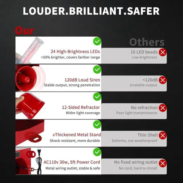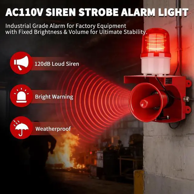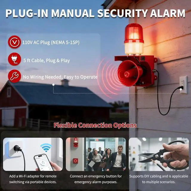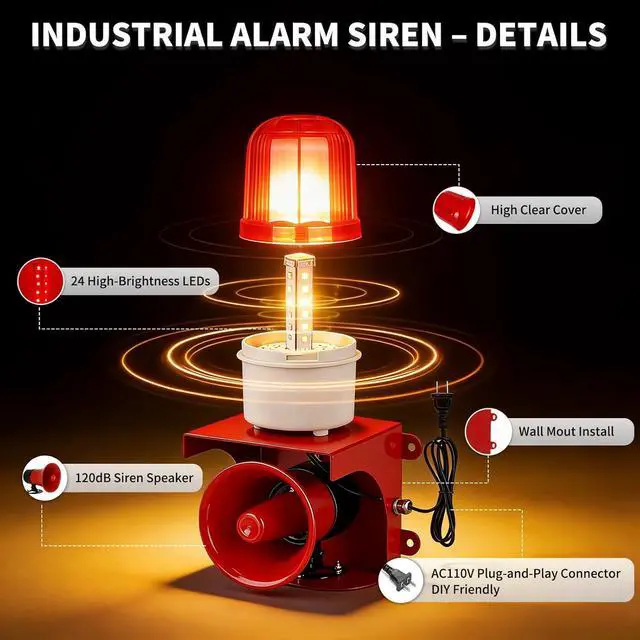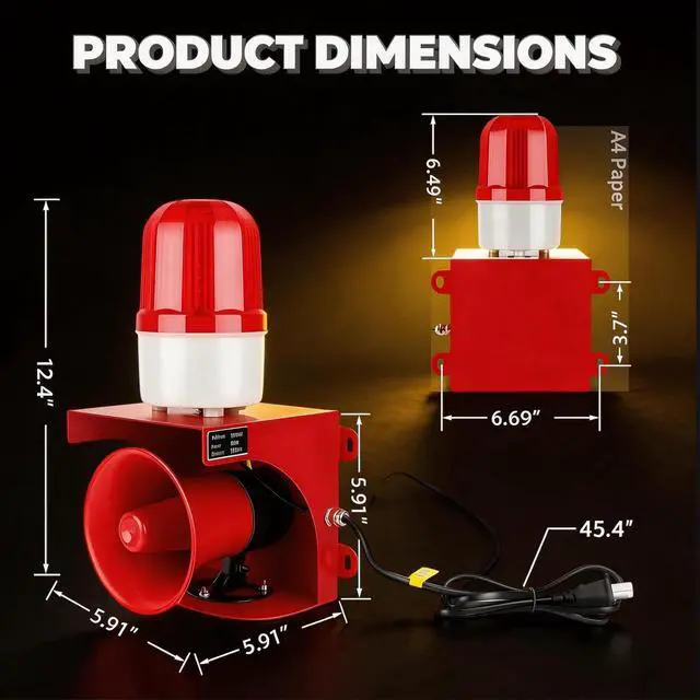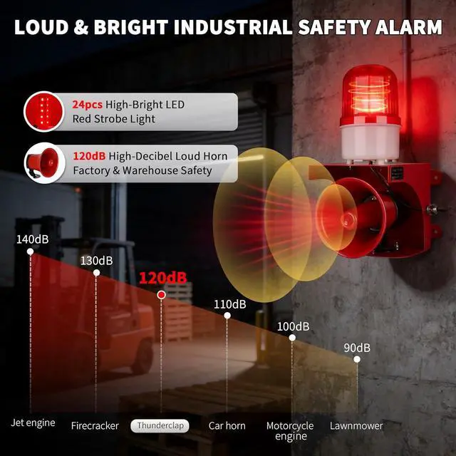 POWER SWITCH& ADJUSTABLE VOLUME The device has an on/off switch for easy activation/deactivation of the warning light and alarm, no frequent power plugging/unplugging needed. It comes with a volume knob, supporting 0-120dB adjustment for flexible setting. The sound can also be turned off independently, leaving only the warning lightensuring a striking effect while avoiding unnecessary noise.