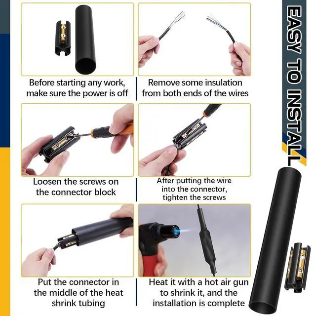 Easy Installation: the wire splicing connectors are easy to install its four position connector ensures a tight connection every time; First remove some of the insulation on both ends of the wires, and loosen the screws on the connector block, but don't loose them too much to avoid them falling off, then once all four wires are in place, finally just tighten each screw on the side you are working on