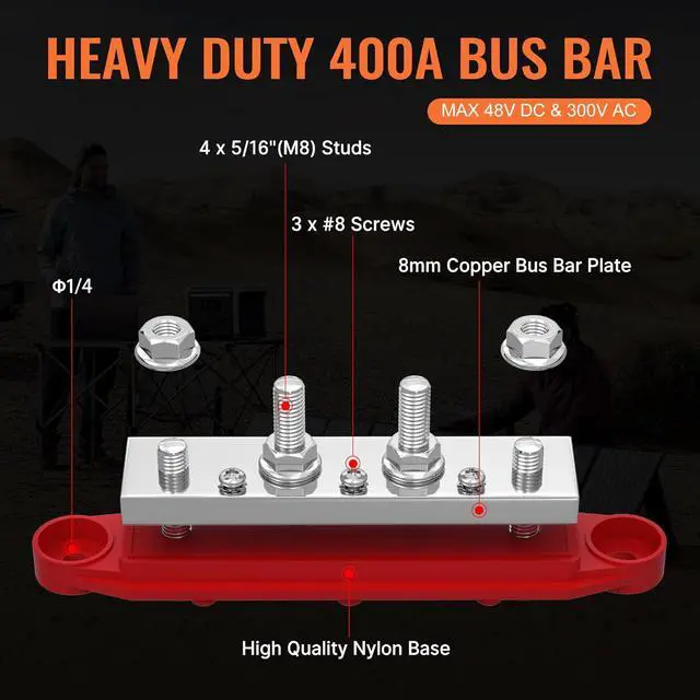 Heavy Duty 400A Bus Bar Power Distribution Block400A Heavy Duty: The 12V Bus Bar rated 400A, besides, this power distribution block can work with MAX 48V DC & 300V AC.