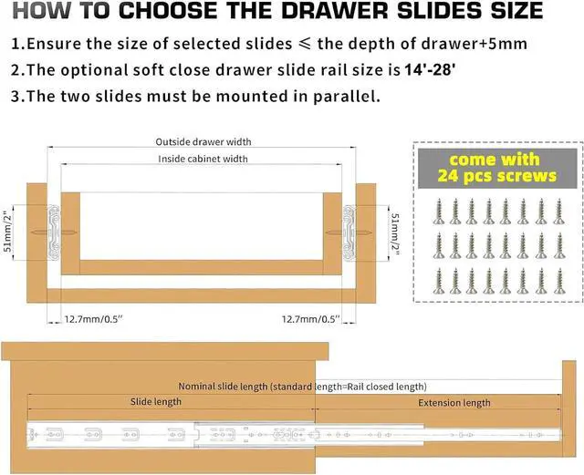 perfect installation: Choose the size of the rails according to the depth of the drawer, ensure the size of selected slides the depth of drawer; Reserve 12.7 mm/ 0.5 inch of clearance for mounting on both sides; Make sure the drawer portion slides parallel to the cabinet portion slides and in the same level.