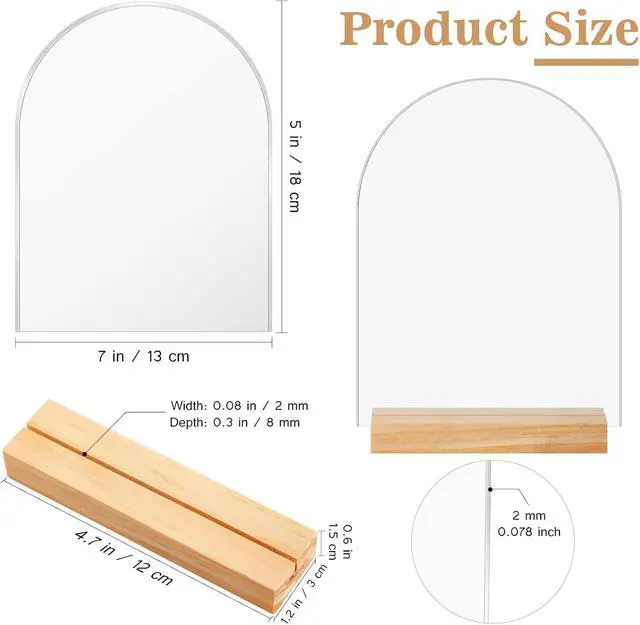 Reliable Material: these clear blank acrylic sheets are made of quality acrylic and the wood sign holders are made of natural pine wood; The wooden base has gone through multiple processes, which is smooth in surface without wood chips, can be well combined with the arch acrylic plaque together, making them stably stand on the tabletop