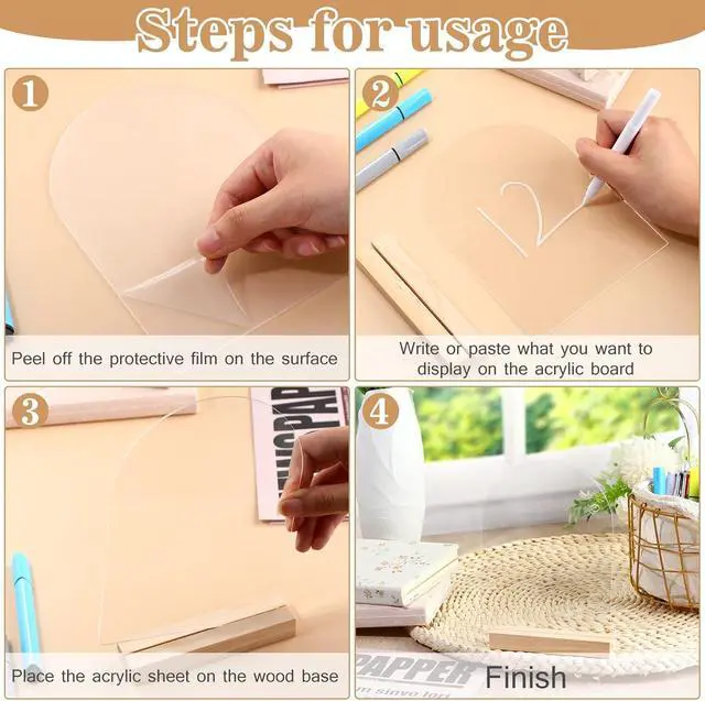 Usage Scenarios and Precautions: to prevent scratches, the clear acrylic sheets are covered with protective film on both sides, so please peel it off before you use them; You can write words on them with water or oil based paint pen; They can be applied as wedding party table number signs, restaurant menu holder, music plaque, crafts, DIY painting, acrylic welcome signs, table signs for events, wedding gifts and more