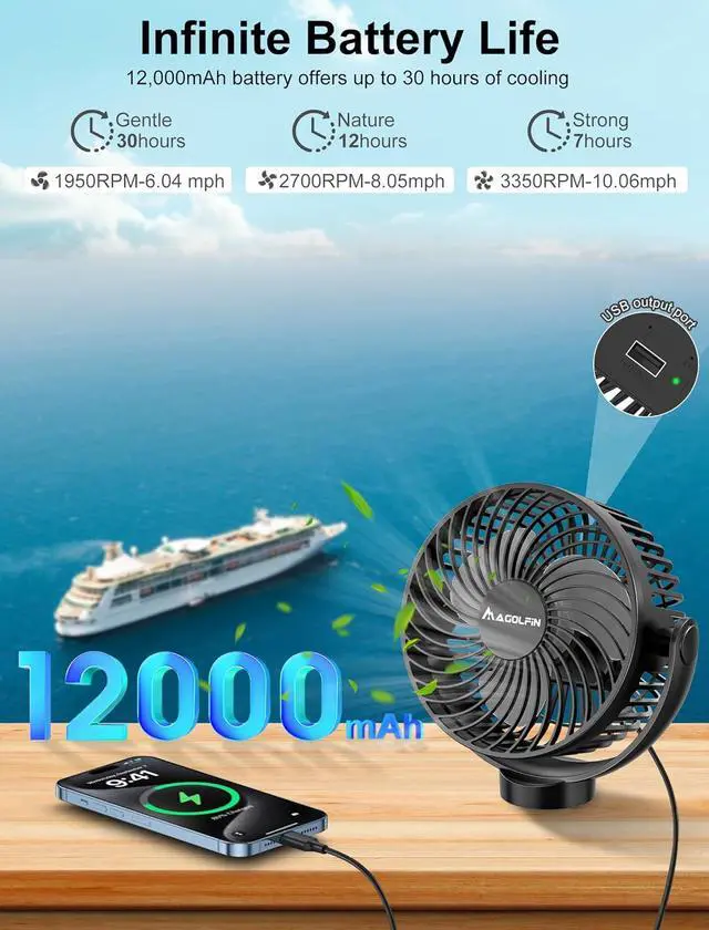 12000mAh Long-Lasting Battery with Fast Charging Equipped with a powerful 12000mAh rechargeable battery, this cruise ship fan provides 7-30 hours of continuous operation on a single charge. It supports 5V-2A fast charging with both USB and Type-C ports. The Type-C port allows simultaneous use while charging, while the USB port enables on-the-go phone chargingperfect for long days at sea.