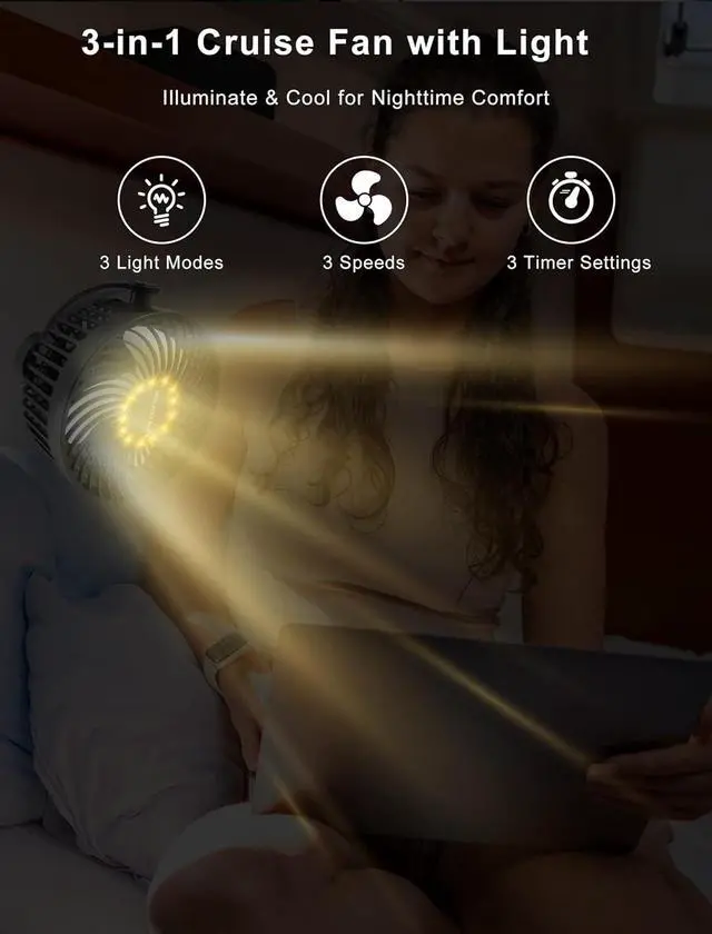 Versatile for Multiple Uses & Lighting Options This cruise ship fan is designed to attach securely to any metal surface, making it perfect for cruise ship cabins, balconies, workbenches, kitchens, gym equipment, and even trucks or RVs. The 3-level adjustable LED light makes it an excellent cooling solution for late-night reading, outdoor dining, or power outagesalso a great travel gift for family and friends!