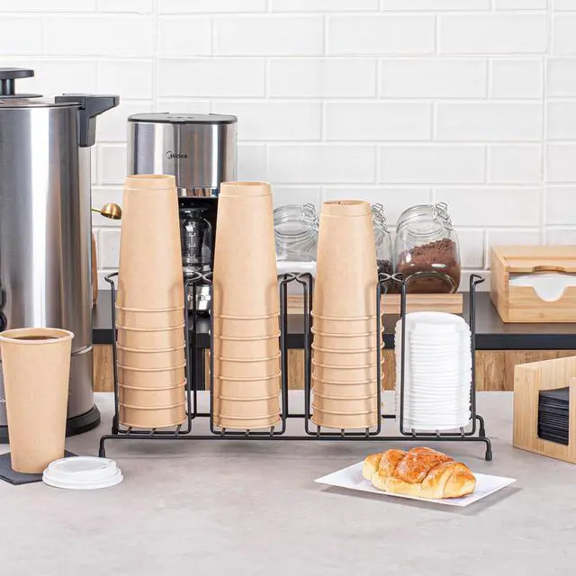 Enhance beverage station efficiency with a streamlined cup and lid display. The Restpresso Four-Section Space-Saving Cup and Lid Display combines four sections that organize cups and lids efficiently, reducing clutter and speeding up service. Crafted from durable black iron, this iron condiment holder withstands daily use in high-traffic foodservice settings, ensuring longevity and reliability. Its compact dimensions of 18.5 inches in length, 8.5 inches in width, and 5 inches in height allow it to fit neatly on countertops, maximizing space without sacrificing functionality. The sleek black finish of this wire cup and lid caddy adds a modern, professional aesthetic to any beverage station, enhancing overall presentation. Perfect for coffee shops and self-service stations, it offers quick access to drinkware, improving workflow. Streamline operations with this versatile cup and lid display. Each order includes 1 Restpresso Four-Section Space-Saving Cup and Lid Display.