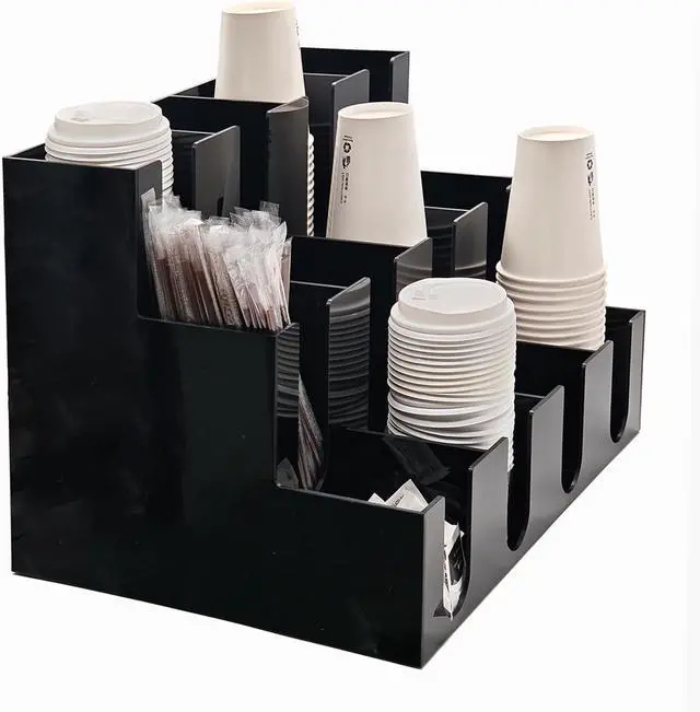 This acrylic coffee cup dispenser is a perfect addition to any home or office. It is made of high quality acrylic material and is durable and sturdy. The dispenser is easy to use and have 12 compartments for cups and lids. It has a sleek and modern design that is sure to impress your guests. The dispenser is also easy to clean and maintain, making it a great choice for busy households.