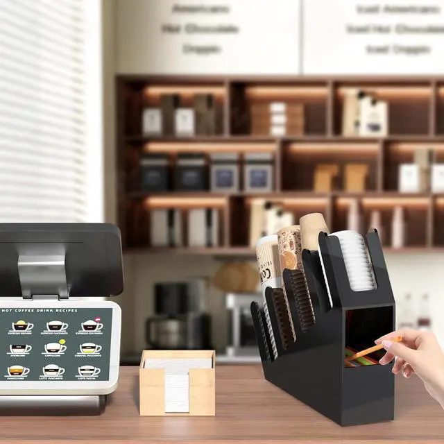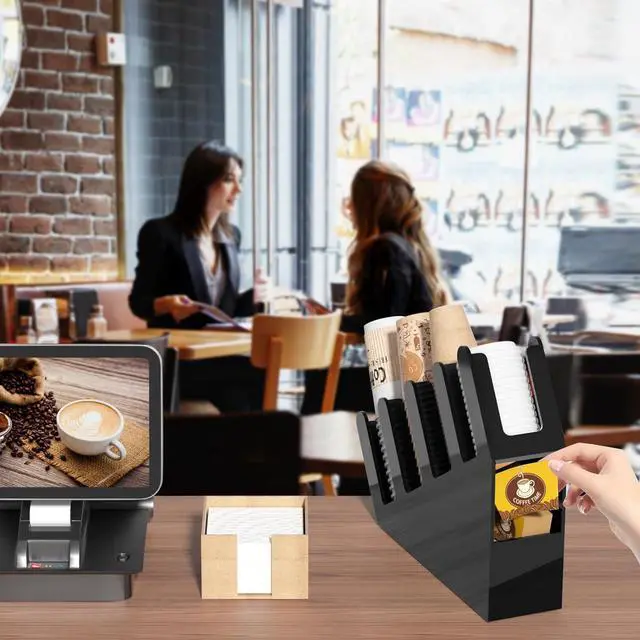 STRONG AND STURDY: ample space for storage, disposable cups, straws, spoons, forks, knives, napkins, condiments are easily accessible when storing in multiple racks neatly and orderly, effectively keeps coffee station accessories organized, this slanted acrylic cup and lid holder as coffee shop essentials is easy to clean, heavy duty coffee bar organizer is convenient for grabbing on-the-go cups, wide openings on each compartment helps ease on refills and take out the disposable coffee cups