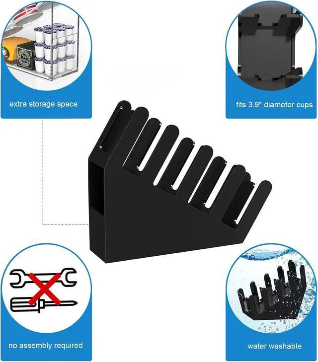 • INTEGRATED COFFEE POD HOLDER: this restaurant quality inclined coffee cup holder is suitable for 8 oz 10 oz 12 oz 14 oz 16 oz 20 oz 22 oz paper and plastic cups, equipped with a deep and spacious storage tray in the bottom, practical and space-saving, acrylic cup holder keeps your cup sleeves, lids, K pods, tea, sugar packets, creamers, stirrers and straws organized without getting annoyed with them falling all over in your cupboard or drawers