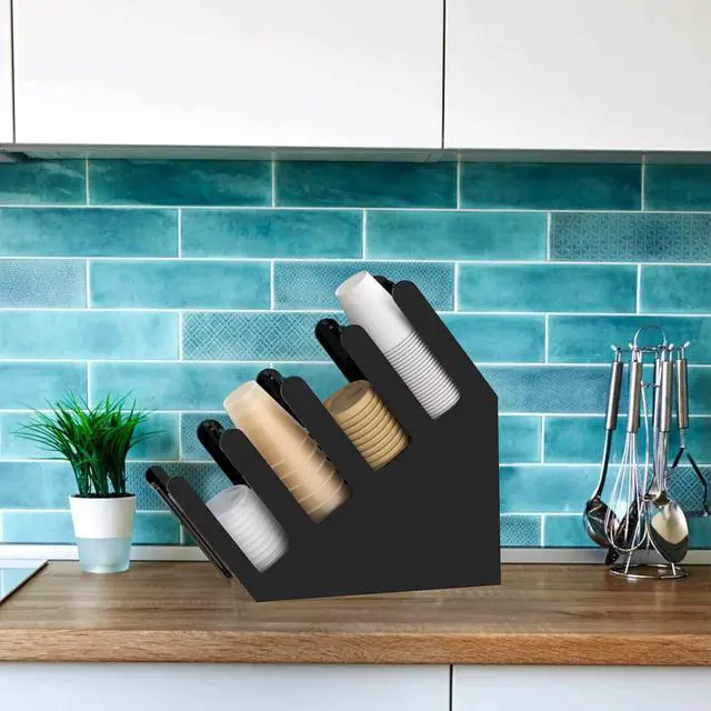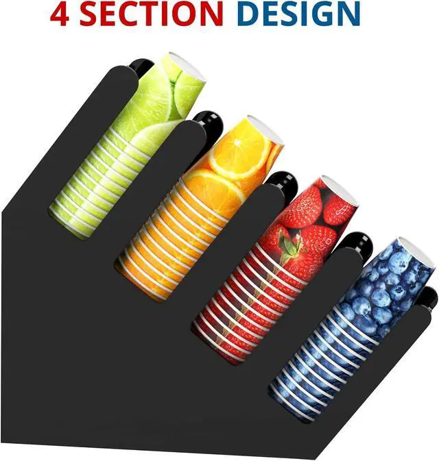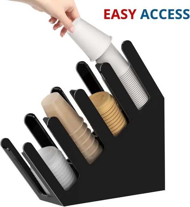 • Large Capacity - NO CUPS INCLUDED, acrylic cup holder fits 4 to 12 oz cups and lids, with 4 individual compartment, you can store disposable cups, lids, sugar packets/coffee tea condiments separately, keeps your kitchen bar countertop organized.