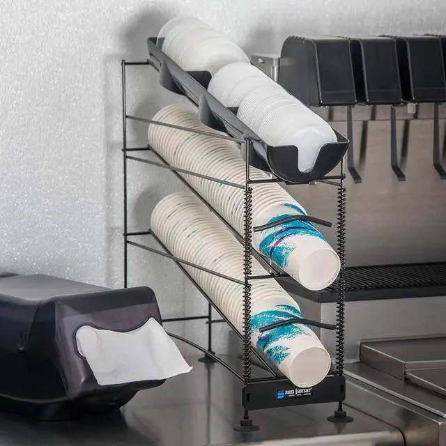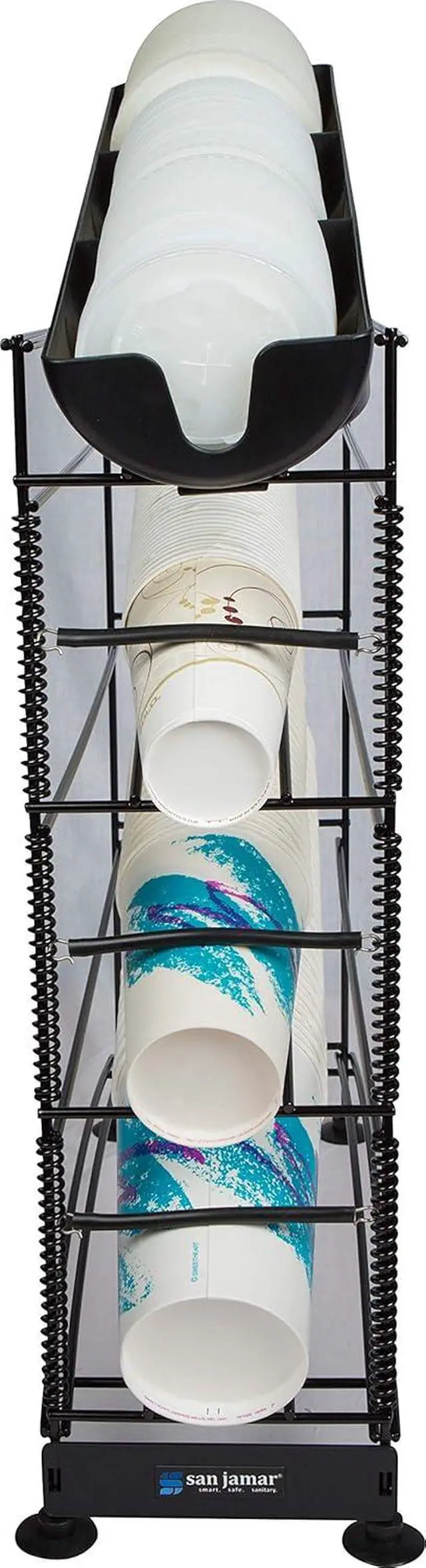 Keep cups and lids organized and easily accessible with the Cup and Lid Dispenser. This convenient 4-tier unit neatly dispenses cups ranging from 8-44 oz for efficient self-serve in busy restaurants and food service operations. The adjustable coils easily accommodate paper, plastic or foam cups for versatile use. Dispense anything from small espresso cups to large 44 oz fountain cups. It also works great for lids, letting you consolidate cups and lids in one space-saving unit. Suction cup feet grip the countertop firmly, preventing the dispenser from sliding around during high-traffic use.