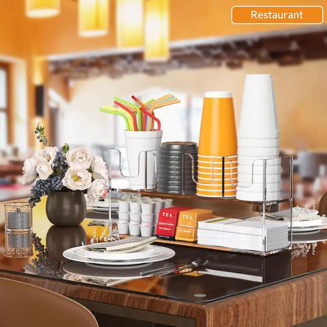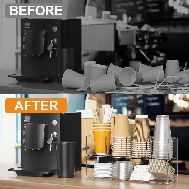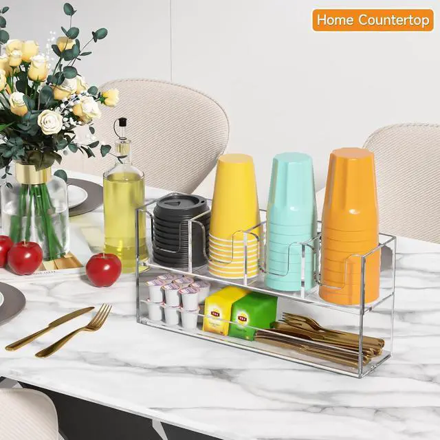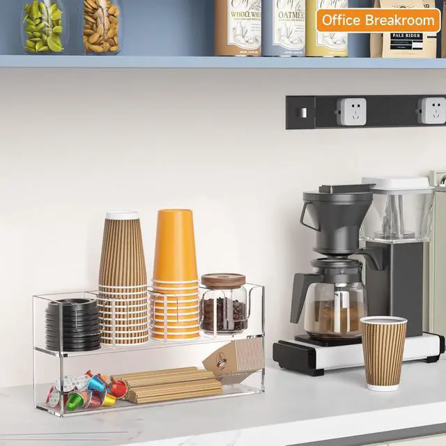 DURABLE - acrylic cup holder is modern and stylish for your kitchen& break room coffee station, ideal for coffee bar in the office, drinks station in your trailer, useful, practical and functional, coffee cup holder for countertop fits in your kitchen cabinets, makes a nice addition to restaurant supplies too, helps organize coffee-related items and reduce cup waste