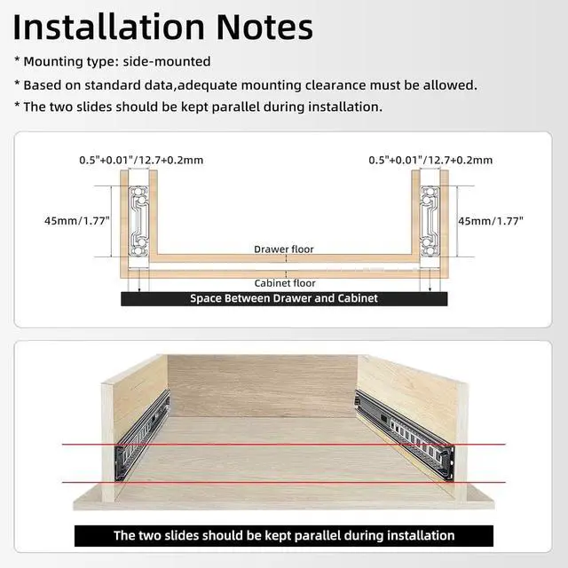 mounting clearance: 0.5" ( 12.7 mm). 8 mounting screws are included in both ends of the product package. When installing, please push the inner ball bearing to the top of the slide rail first, then connect it with the slide rail, and finally complete the installation with a slight push.