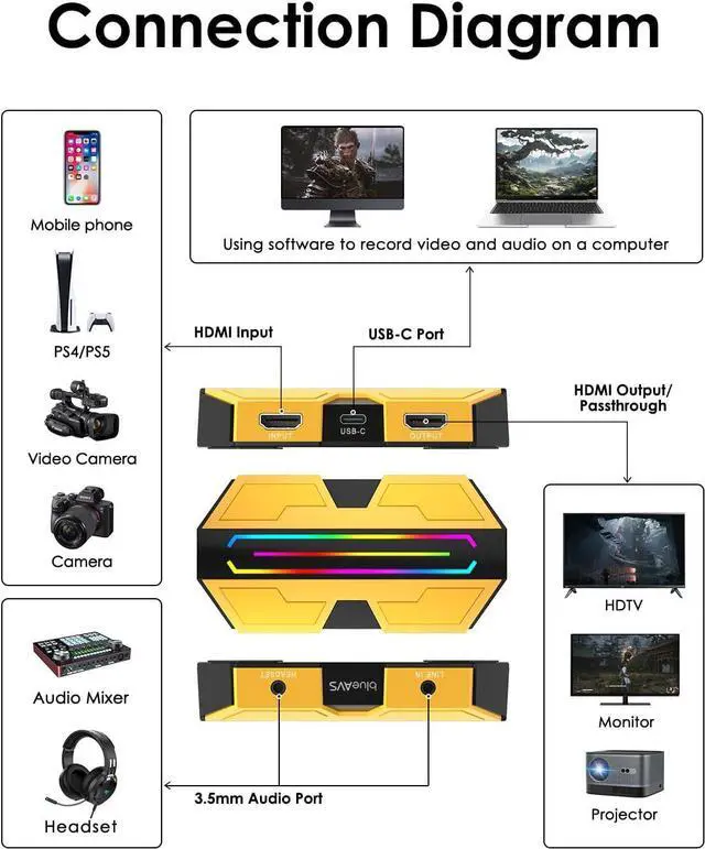 Flexible Audio Mixing with 3.5 mm PortTake complete control of your stream's audio with the dedicated 3.5 mm audio port. Support both line-in audio for external sources and headset audio for easy voice chat capture, giving you professional-grade sound mixing capabilities in one compact device.