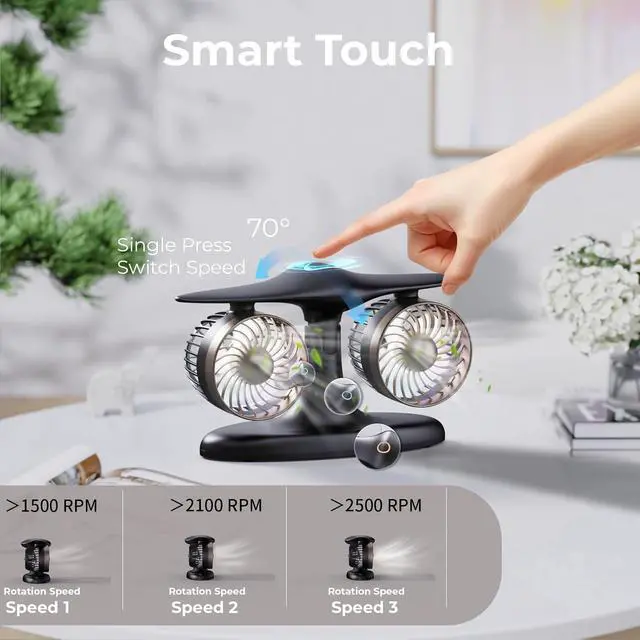 Compact& Multi-Directional: With a slim 1-inch depth and 70° adjustable tilt, this portable fan can be easily positioned on a desk, nightstand, or kitchen counter for targeted comfort