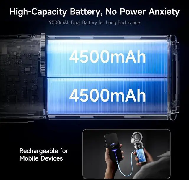 100-Level Stepless Speed Control + LED Display The stepless knob enables precise adjustments in 0.1 increments, with an LED screen showing real-time wind speed (1-100 levels) and battery life. Customize your cooling experience with unmatched precision