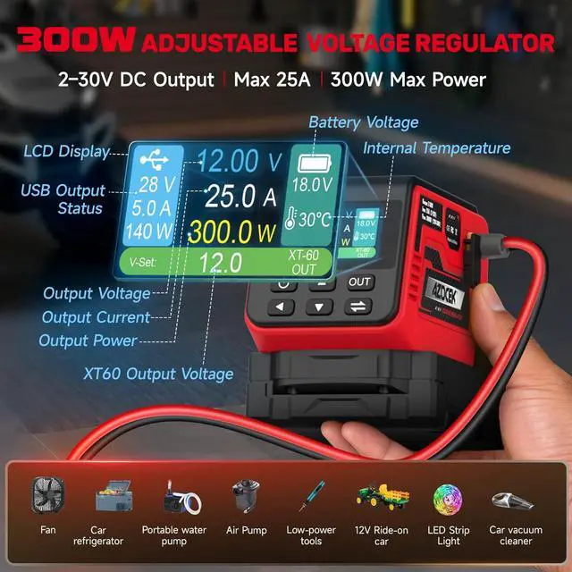 LCD Display & Easy Controls: Large 1.9 -inch LCD screen displays real-time voltage, current, power output, battery level, and internal temperature. Intuitive buttons allow quick and precise voltage adjustment with confidence