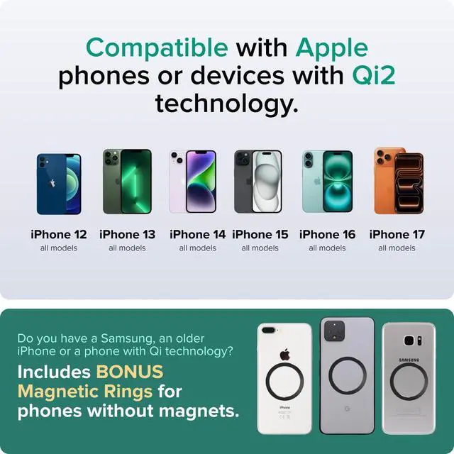 COMPATIBILITY: iPhone 12, 13, 14, 15, 16, 17 & select Android phones. This mag charger stand is compatible with devices that have Qi2 technology. If your phone has only Q1 wireless charging then we include a magnetic ring for you to attach to your phone or case to hold it to our magnetic charging stand.