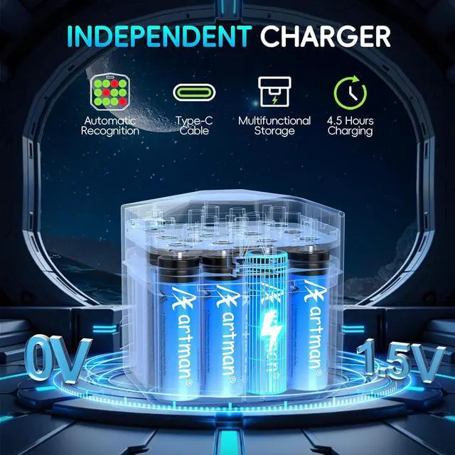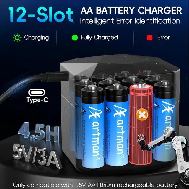 0V Activation Refresh Charging: This advanced restores optimal performance in 0V AA lithium batteries, even after prolonged storage. Features proprietary reactivation technology and is compatible with Artman 1.5V aa rechargeable lithium batteries