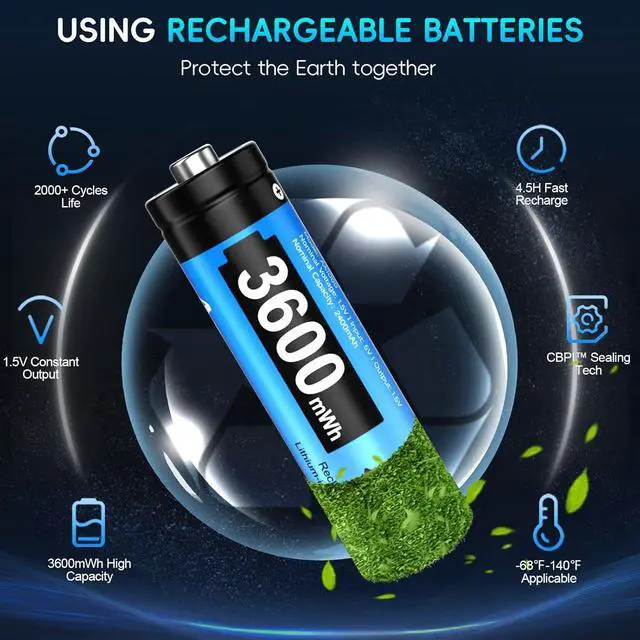 Advanced CBPI AA Lithium Rechargeable Batteries: With 96.8 % space efficiency, these 1.5V lithium batteries aa rechargeable deliver 2000+ cycles and superior power density and outperforming NiMH/alkaline in lifespan, safety and compact performance
