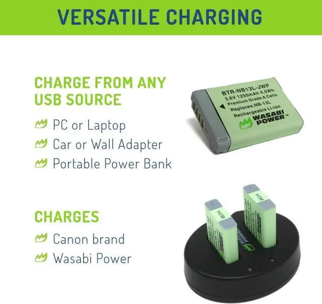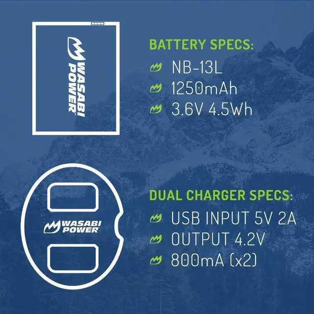 INCLUDES - 2 batteries and 1 dual USB charger for the Canon NB-13L so you always have the power you need