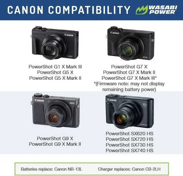 This battery and charger kit includes 2 batteries for the Canon NB-13L and one US charger with a 12V car adapter and European adapter. All items meet or exceed OEM standards and come with a 3-year manufacturer warranty. Need a Canon G7X battery? A replacement for the Cannon camera battery NB-13L is the perfect fit.