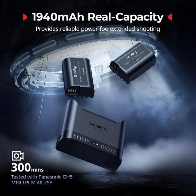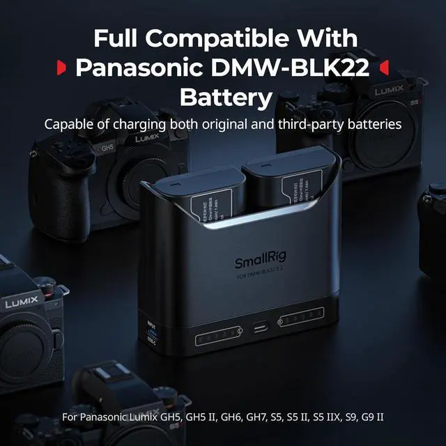 2H Dual-Slot Rapid Charging& 1940mAh BatteriesThe DMW-BLK22 battery charger kit includes two batteries with a true capacity of 1940mAh. Featuring a dual-slot design, the charger fully charges both DMW-BLK22 batteries in approximately 2 hours and can also charge a single battery individually. The efficient charging system significantly reduces wait times, ensuring your S5 IIX and S5 II camera batteries are ready quickly to meet extended shooting demands
